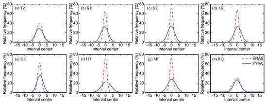 As is shown in Figure 12 and Table 3, there are three major discrepancies in bias PDF between ERA5 and FY4A. The first one is the variation range of Xc. The Xc of the ERA5 bias PDF ranges from −0.429 to −0.016, and all of the biases of ERA5 are negative values, with the average of their absolute values being 0.142. The Xc of GIIRS/FY-4A ATPs bias PDF ranges from −0.645 to 0.478, and only four out of eight biases of GIIRS/FY-4A ATPs are negative, with the average of their absolute values being 0.319, which is larger than that of the ERA5 ATPs. The second difference lies in the maximum value of the PDF curves. The maximum value of ERA5 bias PDF ranges from 29.888 to 73.726, and the average value is 60.562; the A of the GIIRS/FY-4A ATPs bias PDF ranges from 22.068 to 36.179, with an average of 30.134, much smaller than that of the ERA5 ATPs. Meanwhile, the maximum value of the GIIRS/FY-4A ATPs bias PDF remains almost all the same at the eight stations, but the peak value of the ERA5 ATPs bias PDF changes from the desert station (TZ) and the small-area oasis station (RQ) to the other oasis stations. The top values of the ERA5 ATPs bias PDF at TZ and RQ stations are similar to that of the GIIRS/FY-4A ATPs bias PDF, but much larger at the other six oasis stations. The third difference is that the Confidence of Determination (COD) of the GIIRS/FY-4A ATPs bias PDF is slightly smaller than that of ERA5 generally. The mean COD of the GIIRS/FY-4A ATPs bias PDF is 0.986, and that of ERA5 is 0.997.