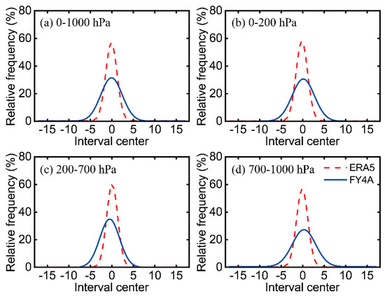 Bias PDFs of ERA5 ATPS and GIIRS/FY-4A ATPS in different layers of all eight stations. The subplot (a) indicates the PDF curves of both ERA5 ATPs and GIIRS/FY-4A ATPs at pressure layers from 0 hPa to 1000 hPa, while (b) is for 0 to 200 hPa, (c) for 200 to 700 hPa, and (d) for 700 to 1000 hPa. The red dashed lines stand for the PDF curves of ERA5 ATPs, and the blue solid lines for the PDF curves of GIIRS/FY4A ATPs.