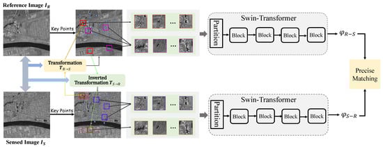 Hence, we design a double-transformation network that directly constructs two branches to train the multi-classification registration model, rather than a single branch network. In the proposed method, one branch is trained based on samples corresponding to m key points from the reference image, and the other is trained based on samples corresponding to n key points from the sensed image. Based on this, two datasets are constructed for two branches: the R-S data (for the R-S data, its training set contains samples with m classes, and its testing set contains n samples), {, }, and the S-R data (for the S-R data, its training set contains samples with n classes, and its testing set contains m samples), {, }, and the details are given in Section 3.1.1. Then, two multiple classification branches (sub-networks) are, respectively, constructed to find the matched-point pairs between reference and sensed images, defined as the R-S branch () and the S-R branch (), respectively. Here, the Swin-Transformer [] is used as the basic learning network, as it has achieved the remarkable performance in many applications.
