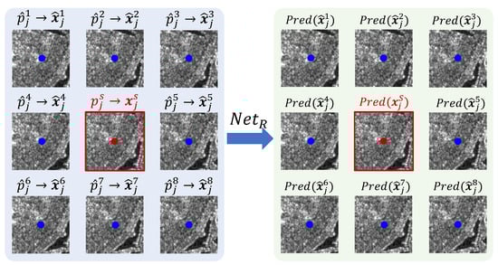 A visual example of eight near-points around a key point from the sensed image with k pixels, where and the predictions are obtained by the R-S branch ().