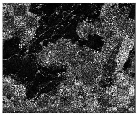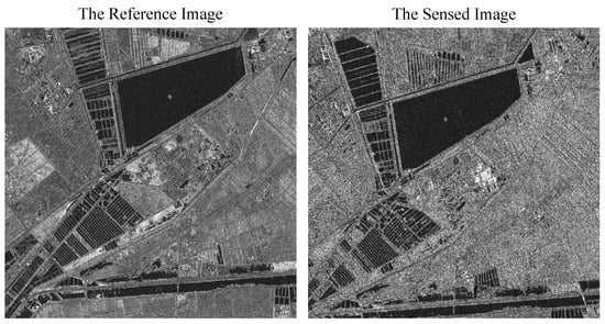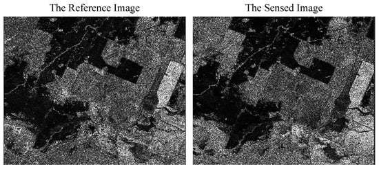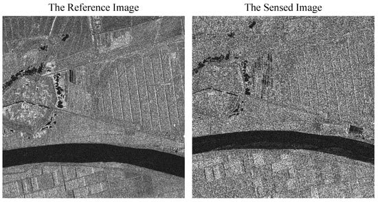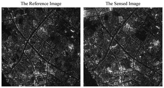 Due to the special characteristics of synthetic aperture radar (SAR) [], SAR image processing has been widely used in many fields [,]. In particular, some applications [,,,,], such as SAR image change detection [], SAR image fusion [,], open set recognition [], etc., require the simultaneous processing of two or more SAR images. However, SAR images are generally obtained by different sensors under different conditions (such as time, viewpoint, noise). This leads to some differences among these images. Therefore, the registration of two or more SAR images becomes indispensable and significant. SAR image registration [,,] is used to match two SAR images by exploring the geometric transformation model between them, where two images are called the reference image and the sensed image. At present, many registration methods [,,,,] have been proposed to achieve the registration of two SAR images, and they can be simply divided into the traditional registration methods [,,] and the deep-learning-based registration methods [,,,,]. Due to the prominent performance of deep learning, the deep-learning-based method of SAR image registration has recently received more attention compared to traditional methods.