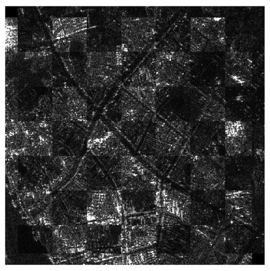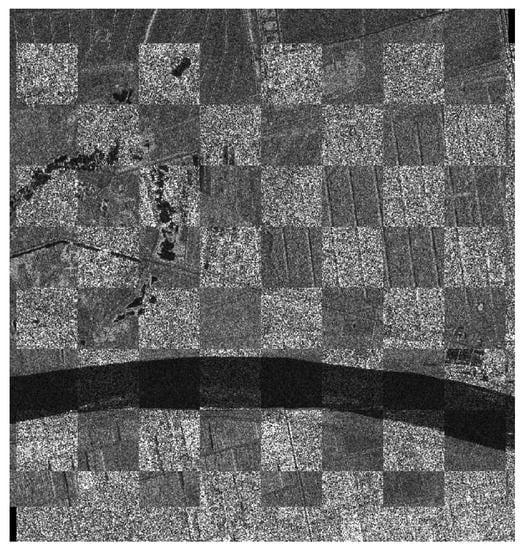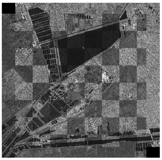 In this part, we draw the chessboard map (CB-map) of two matched SAR images to visually show the registration results on four datasets. Figure 7, Figure 8, Figure 9 and Figure 10 show the CB-maps for four datasets, respectively. In each figure, the chessboard mainly focuses on the overlapping region of two image registrations, and the size of each checker is set based on the size of each datum. Except for the overlapping region, the other regions are filled by their corresponding images (reference or sensed image). For example, in Figure 9, the rightmost area of the CB-map is filled by the sensed image; meanwhile, the leftmost area of the CB-map is filled by the reference image. In order to enhance the visual effect, the contrast ratio between reference and sensed images is increased by darkening one image or brightening the other image.