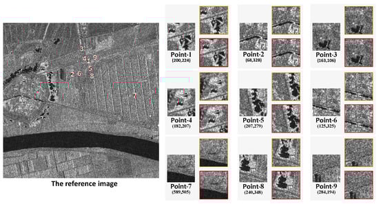 Additionally, in order to verify the effectiveness of the precise-matching module more intuitively, we show some visual results. First, nine points were selected from the reference of Yellow River R1 data, and the obtained matched-points corresponding to nine points before and after using the precise-matching module are given. Then, their corresponding sub-images are captured from the reference image. Figure 11 shows the comparison of sub-images corresponding to nine matched-points pairs obtained by the proposed method without precised-matching module and with precise-matching module, where the locations of nine points in the reference image are given and the matched results with precised-matching module are labeled in the red box. From Figure 11, it is observed that the sub-images corresponding to the matched-points obtained by the proposed method with the precise-matching module are more similar to the original sub-images of nine points than without the precise-matching module. It also illustrates that the precise-matching is effective for improving the performance of our method.