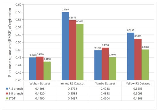 In this part, we give an analysis of the proposed double-transformation network. Figure 12 shows the comparison of the root mean square error (RMSE, ) obtained by the proposed method (with two branches) and only using one branch (the R-S network or the S-R network) for the four datasets. From Figure 12, it is seen that the proposed method obtains more registration results than only using the single network, which indicates that our double-transformation network can seek more accurate matched-points between two images compared with two single networks (the R-S network or the S-R network), since these matched-points pairs are obtained based on two multi-classification models which are trained in two feature spaces.