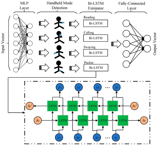 Next is the Bi-LSTM layer. The input vector of the Bi-LSTM model is the pre-processed sensor data and the detected handheld mode of the smartphones. The relationships among the different Bi-LSTM parameters are presented as follows [40]: