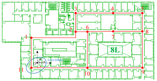 In this section, the error ellipse-enhanced unscented Kalman filter (EE-UKF) is used to integrate all of the results provided by the integrated sensors, pedestrian indoor network matching, and floor detection for achieving meter-level indoor localization precision. The error ellipse is generated based on the previous integration result of the indoor network observation and data and model dual-driven trajectory estimator.
