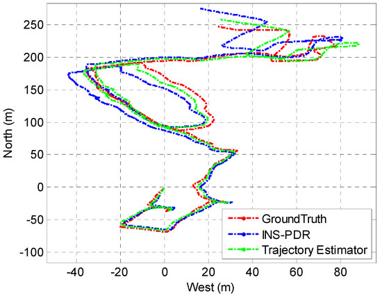 The results described in Figure 6 illustrate that the developed trajectory estimator maintained a long-term error of no more than 5.95 m in 75% of cases, which is superior to the INS-PDR approach, which had an error of up to 9.73 m in 75% of cases. This improvement can be attributed to the hybrid observations and constraints utilized by the proposed estimator.