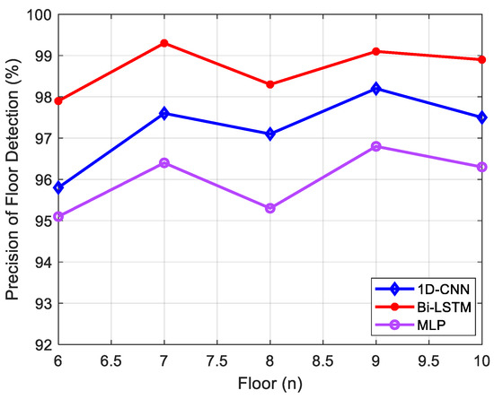 As shown in Figure 8, the Bi-LSTM-based floor recognition model proposed in this study demonstrated superior accuracy compared to the 1D-CNN and MLP algorithms. The test dataset achieved an average accuracy of over 98.7% using the proposed approach, whereas the 1D-CNN-based approach and MLP-based approach resulted in average accuracies of 97.2% and 95.98%, respectively.