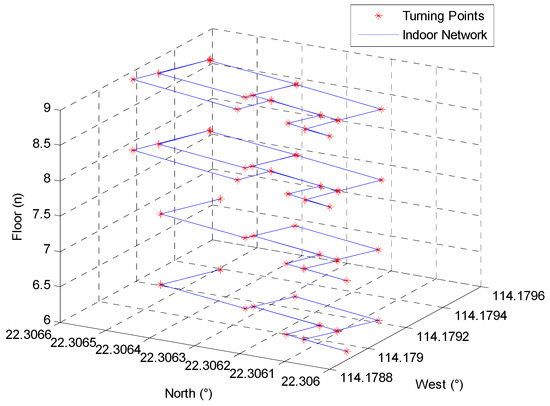 As illustrated in Figure 10, the extracted indoor network comprehensively covers all pedestrian walking route and turning point information within multi-floor contained indoor building environments. Therefore, this study proposes an indoor network matching algorithm to enable absolute turning point references for optimizing and calibrating raw trajectory estimator results, while the floor recognition algorithm is employed to achieve dynamic floor indices of the trajectory estimator.