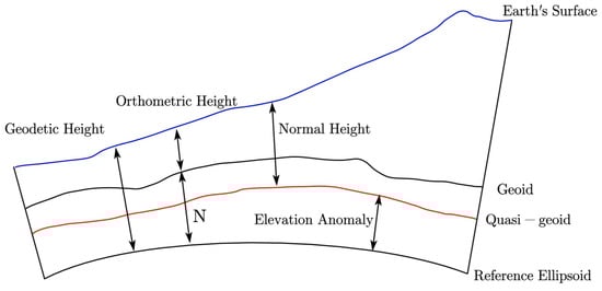 The geodetic height of a point on the earth’s surface consists of two components as shown in Figure 1 and Equation (1): is the orthometric height, is the elevation of the geoid, is the normal height, and is the elevation anomaly.