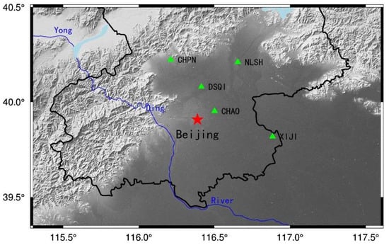 This paper uses the subsidence area of Beijing as a case study to demonstrate dynamic maintenance of the elevation reference system. The proposed technique involves five CORS stations—CHPN, NLSH, XIJI, CHAO, and DSQI—distributed as shown in Figure 2 for maintaining elevations in the subsidence area of Beijing.