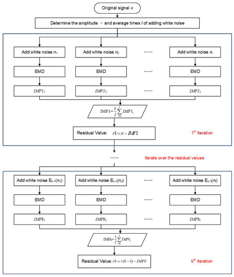The individual components of the IMF represent each frequency component of the original signal and are arranged in order from high to low frequency. However, the IMF obtained by EMD suffers from modal aliasing, where signals of different feature scales can be present in one IMF component or signals of the same feature scale can be dispersed into different IMF components. CEEMDAN improves upon EMD by exploiting the property that white noise has a mean value of 0. It achieves better decomposition results by introducing uniformly distributed white noise or IMF components of white noise several times during each decomposition process. Figure 3 illustrates the flowchart of the CEEMDAN algorithm, where denotes the order IMF of .The result from the CEEMDAN is as Formula (2):