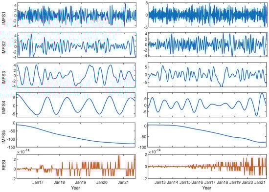 CEEMDAN decomposition results in mm for CHAO (left) and XIJI (right) station.