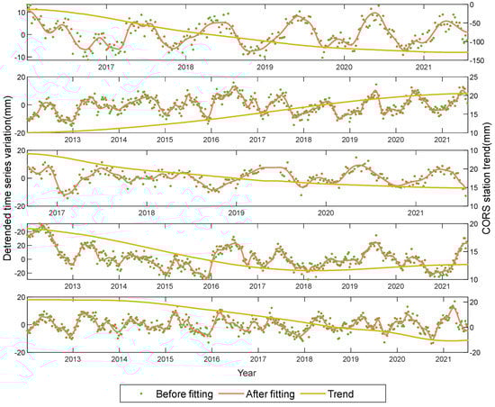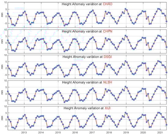 Figure 4 illustrates the outcomes of applying CEEMDAN to data from the CHAO and XIJI CORS stations. The method effectively decomposes the high-frequency noise, medium-frequency periodic signal, and low-frequency trend signal present in the observation data. Specifically, IMF1 and IMF2 correspond to high-frequency noise signals, IMF3 represents a mixture of some periodic signals at medium frequencies, IMF4 corresponds to the annual signal, and IMF5 captures the motion trend of the CORS stations. After ignoring noisy signals at high frequencies, the periodic and trend signals are interpolated and smoothed with linear interpolation and smooth spline fitting, respectively. The result is a GH variation time series with a one-day time resolution. Figure 5 presents the time series results for the five CORS stations—CHAO, CHPN, XIJI, NLSH, and DSQI.
