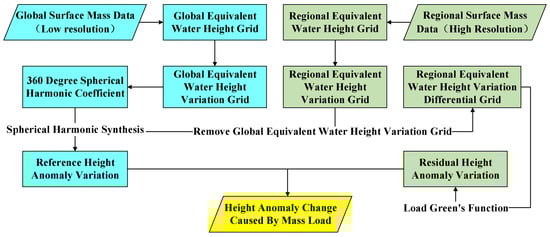 From the theory of surface mass loading deformation, it is known that the reference height anomaly caused by the change in surface mass loading is determined by Formula (7).