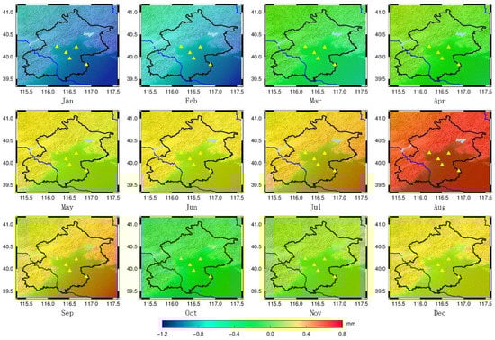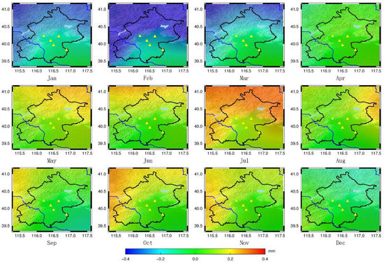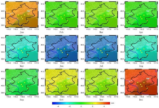 Height Anomaly Variations in Beijing caused by Surface Loading on the 15th day of each month in 2018. (Triangle represents the CORS in Beijing).