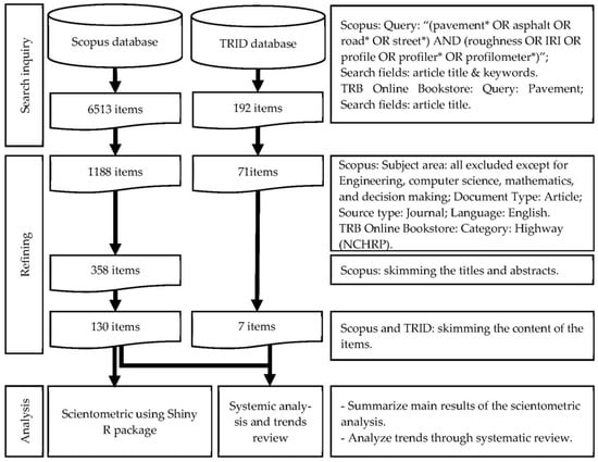 As shown in Figure 2, the search query of “(pavement* OR asphalt OR road* OR street*) AND (roughness OR IRI OR profile OR profiler* OR profilometer*)” was utilized to retrieve the relevant literature in the Scopus database. The asterisk “*” was used to account for the different variants of the keywords (e.g., the plural form). The search fields were limited to article titles and keywords to obtain the most relevant publications. To obtain syntheses describing the industry practices, the search was conducted using the TRID [34]. The keyword “pavement” was used as a search query to retrieve relevant publications. All publications with “pavement” in their titles were retrieved. As a result, 3236 and 192 items were retrieved from Scopus and TRID, respectively.
