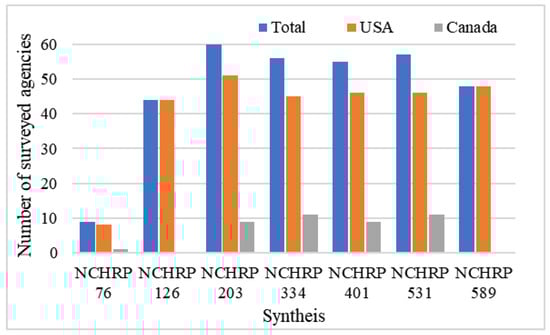 The syntheses are based on extensive surveys designed to capture the practices in pavement data collection and management in the USA and Canada. The number of agencies surveyed in the seven utilized syntheses is shown in Figure 3.