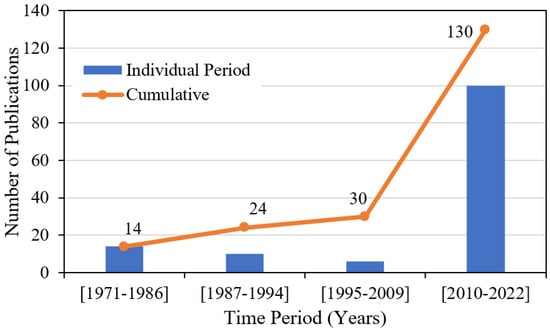 This study makes use of 130 original articles. The retrieved articles were published over a time period of about half a century (1971–2022). The annual growth is about 6.2%, whereas the documents’ average age is about 12 years. Figure 4 presents the number of articles published in the four segmented study periods. The vast majority (77%) of the articles were published in the fourth period (2010–2022), with a yearly production rate of about eight articles. The lowest number of articles was retrieved from the third period (2004–2009), with an annual research output of 0.4 articles.