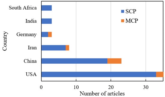 Figure 5 shows the corresponding author’s country. Additionally, it shows the number of single-country publications (SCP), which include only intra-country collaboration, and the multiple-country publications (MCP), which include inter-country collaboration. Figure 5 indicates that most of the articles corresponded to authors from the USA (37) and China (22). Moreover, it is remarkable that most of the articles are SCP, indicating limited inter-country collaboration. In fact, just about 16% of the articles involve intra-country collaboration. The collaborations were mainly found between researchers from the USA and China on the one hand, and other countries, including Poland, the United Kingdom, Iran, and Jordan, on the other.