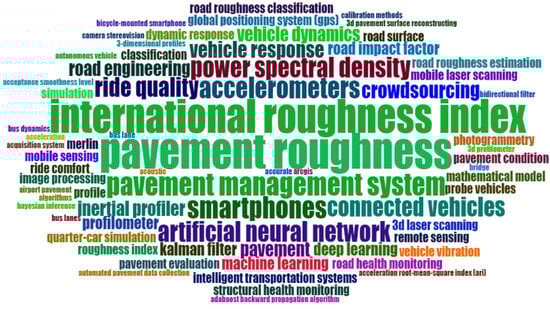 Table 5 presents the fifteen author keywords with the most occurrence and total link strength. Additionally, a word cloud is generated to visualize the occurrence of author keywords, as shown in Figure 6. To derive a better characterization of the retrieved articles, synonym keywords were combined. For example, “smartphone” and “smartphones” were grouped as one keyword. Similarly, “roughness”, “road roughness”, “street roughness”, and “pavement roughness” were also considered as a single keyword. A complete list of the synonym keywords is presented in the Appendix A. As presented in Table 5 and illustrated in Figure 6, “pavement roughness” and “international roughness index” are by far the most used keywords by authors. The first keyword makes a general indication of the research field. The second keyword indicates the popularity of using IRI to measure pavement roughness. The keywords “Smartphones”, “accelerometers”, “connected vehicles”, and “crowdsourcing” appear as the fourth, fifth, tenth, and eleventh most frequently occurring keywords. They represent a contemporary research trend in pavement roughness evaluation. Other keywords such as “Pavement management”, “ride quality”, “pavement profiles”, “pavement condition assessment”, and “Road Roughness Estimation” constitute the main objectives of measuring pavement roughness. “Power spectrum density” is widely used by researchers focused on studying pavement roughness in combination with car ride quality and vehicle suspension. The presence of “Machine Learning” and “Artificial Neural Network” (ANN) among the most frequently used keywords implies the importance of using machine learning for pavement roughness evaluation.