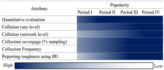 The collection of roughness data has experienced different gradual shifts in the last few decades. Figure 7 attributes the data collection practices over the last five decades. Roughness has been widely evaluated qualitatively since at least the end of the 1970s. The collection of roughness data has been continuously popular among highway agencies. However, the collection of roughness data at the network level was less practiced during the 1980s. Due to the availability of equipment that enables the collection of roughness data at the traffic level, sampling was rarely practiced. Additionally, the frequency of roughness data collection increased over the years to peak on an annual and biannual basis. The use of IRI for reporting roughness has gradually been mainstreamed and became prevalent during the third and fourth periods.