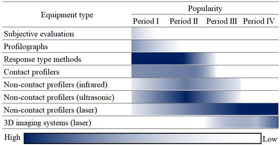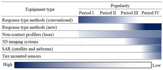 The popularity of different types of roughness measurement equipment in North America over the last five decades is summarized in Figure 8. The use of subjective evaluation was rare even in the 1980s. Multiple agencies used profilographs and contact profilers in the first period. Some types of contact profilers continue throughout the second period before being phased out during the third period. Response-type methods were the primary equipment for measuring roughness during the first and second periods. However, they were gradually replaced by non-contact profilers. During the third study period, response-type methods were entirely replaced by the non-contact profilers. Non-contact profilers of infrared and ultrasonic sensors were quite popular during the second period. However, they were gradually replaced with equipment that comprises laser sensors. The use of 3D imagining systems started garnering attention about two decades ago. Today, many agencies utilize such systems for pavement roughness measurements.
