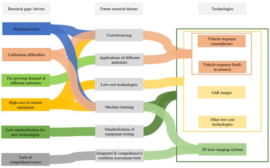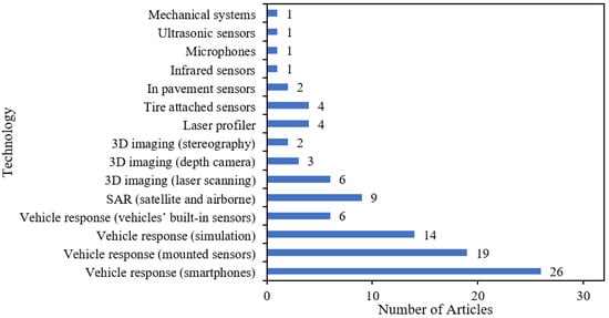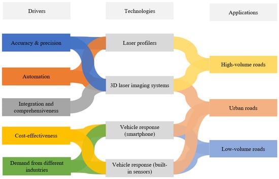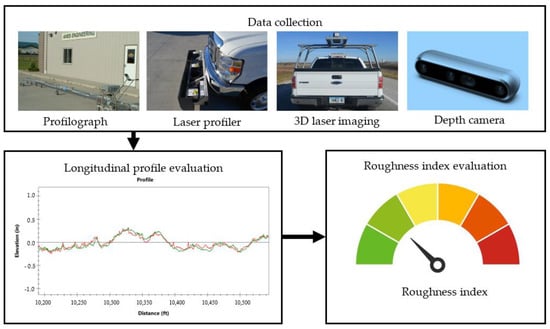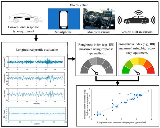 Recently, this type of technology has been revived by utilizing smartphones, vehicles with built-in sensors, and cheap accelerometers. Their application for measuring pavement roughness has been the focus of enormous research efforts [54,55,56,57,58,59,60,61].