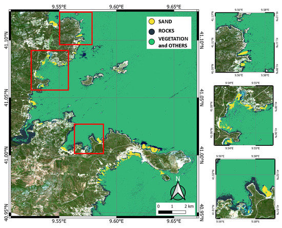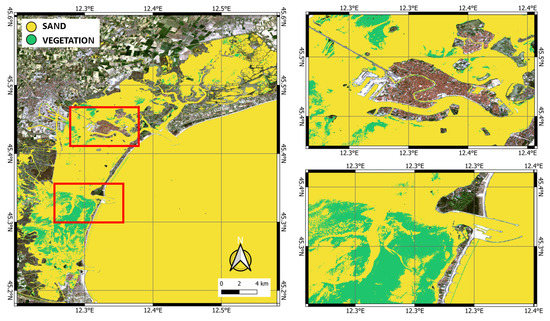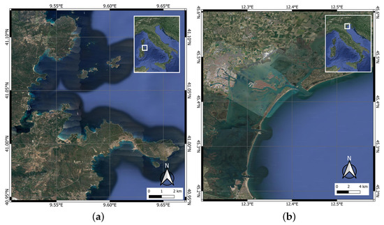 The S-2 Level-2A products for both locations (on 22 June 2020 and 19 March 2020 for the Gulf of Congianus and Venice Lagoon, respectively) were downloaded from the Copernicus Open Access Hub (https://scihub.copernicus.eu/dhus/#/home, accessed on 30 May 2023) of the European Space Agency (Figure 2).