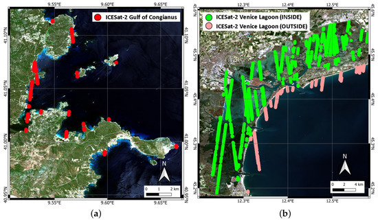 Projection of soundings contained in the trajectories of ICESat-2 beams selected and cleaned for the study areas: (a) Gulf of Congianus and (b) Venice Lagoon.