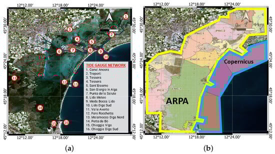 The Venice Lagoon (nautical chart 222 IIM) (the geographical location is between 12.13°–12.7°N and 45.18°–45.6°E) consists of an extended lagoon basin ranging from the mouth of the Brenta River to the site mouth. It is separated from the sea by a tongue of land, artificially reinforced for long stretches by the Murazzi’s wide walls, into which three inlets or ports protected by dykes open (Figure 1b). The city of Venice stretches over a dense archipelago of 112 islets, joined by 400 bridges and intersected by 176 canals. A very long railway and truck bridge, 3601 m long, connects the city to the mainland. The Venice Lagoon represents a unique example within the national and international scenes of a complex system in which history and modernity meet. The entire lagoon, mainly characterized by hardly accessible shallow waters, is traversed by an intricate system of navigable canals that allow the passage of cruise ships, cargo ships, and smaller vessels. Preserving these fragile natural and anthropic environments is a topical issue, considering the increasing maritime traffic in the area. In addition, extreme weather and marine phenomena require special attention. In the Northern Adriatic, the wind and atmospheric pressure effects may add their contributions to the astronomical tides, resulting in sea level excursions even twice as high as predicted. This phenomenon, also known as acqua alta, during the winter months can result in tidal levels as high as 1.5 m above the mean sea level (e.g., +1.94 m recorded on 4 November 1996). For such reasons, the ability to continuously monitor changes within the lagoon is a great advantage, contributing to economic activities and the safety of navigation.