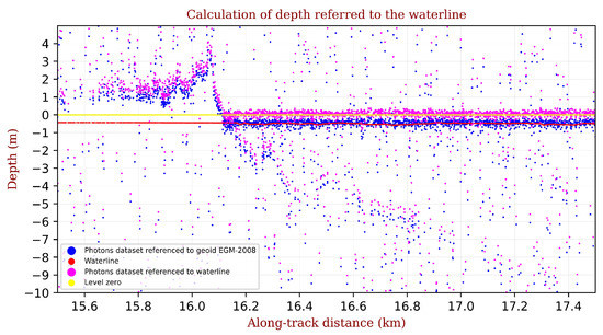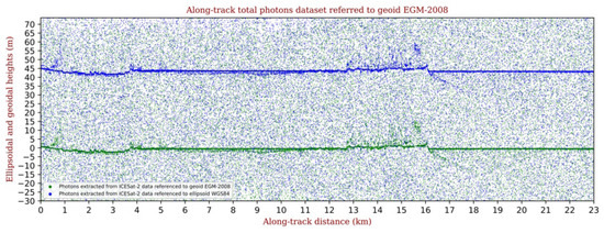 Using ICESat-2’s geoid model, the photon reference system was shifted from the ellipsoid to the EGM-2008 geoid. Note that the geoid value tends to be uniform in geographically restricted areas; instead, if a larger area is selected, differences in the waterline detection may be caused by geoid undulations. Moreover, the geoid and sea surfaces tend to be similar and close to level 0 in seawater masses, ignoring, for now, variations in sea level due to tides (Figure 6: green dots).