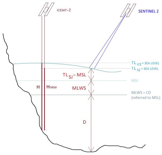 where H = ICESat-2 depth (m), = tide level (m) measured at the time of the ICESat-2 time of acquisition, and = tide level (m) measured at the time of the Sentinel-2 image of reference.