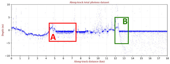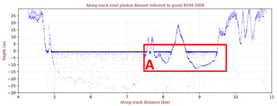 Subsequently, all H photon heights above 1 m and below −20 m in depth were removed. The value of −20 m was selected empirically, taking into account the maximum penetration of light, and thus photons, into the water in the areas of interest; on the other hand, the upper limit of 1 m was defined by taking into account the maximum tide in the selected areas within our time interval.