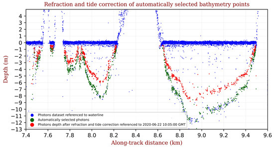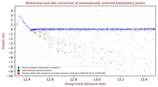 Bathymetry points (in purple) corrected by refraction (green dots) and their tide level correction (red dots) relative to a specific date and time, using local tide gauge measurements. The ICESat-2 data were acquired during a lower tide than the reference time, causing an upward shift.
