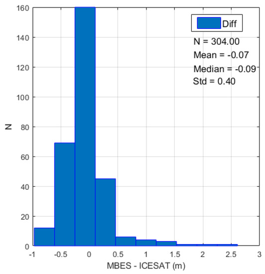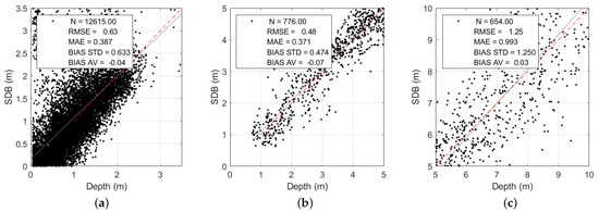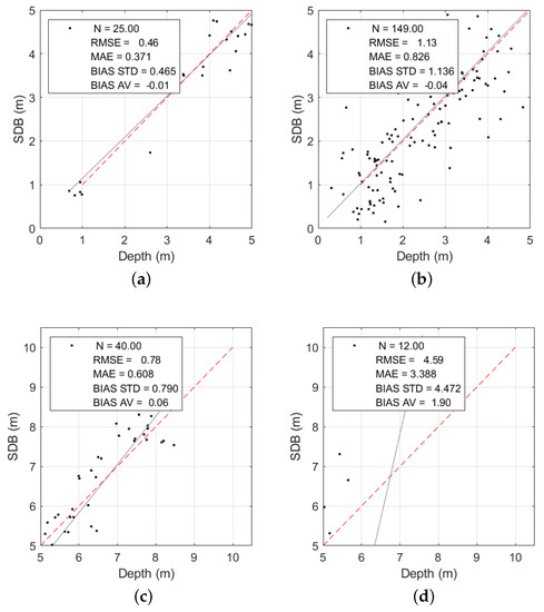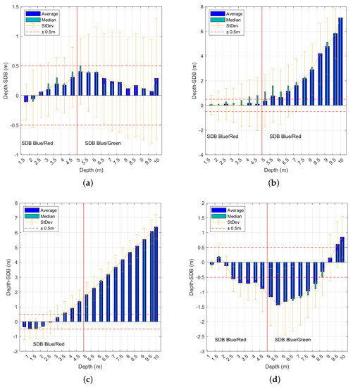 The availability of MBES data in both areas allows a comparison between the computed SDB bathymetry and traditional acoustics data, to check whether the results of this technology can integrate or substitute the hydrographic surveys conducted by vessels, small boats, or airborne LiDAR, having in mind the minimum requirements of the appropriate order of the International Hydrographic Organization S-44 Publication [7], listed in the Appendix in Table A1. The bar charts in Figure 28 depict the differences between the depth values measured with MBES surveys and those with the computed SDBs.