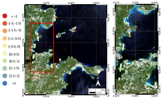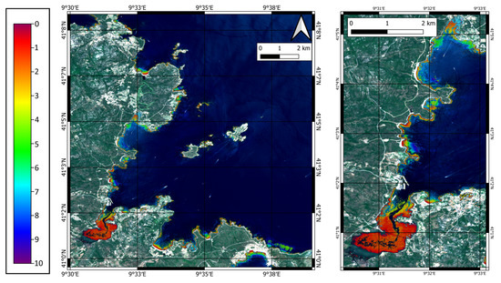 In the Gulf of Congianus, merging the results of the SDB algorithm in the two depth ranges of 0–5 m and 5–10 m, it is clear that the overall accuracy of the SDB is heavily affected by the seabed’s nature. For the rocky area in Figure 28b, the error is small up to 5 m, and then it increases rapidly accordingly to the results of the regression analysis and validation in Section 4.1, probably due to the roughness of the surface and the limited amount of good-quality points available in this range of depth after applying the automatic cleaning procedure. In contrast, in the sandy area in Figure 28a, the difference between the SBD surface and the bathymetric data is small in the whole range of 0–10 m, with a maximum error of around 5 m, which is the interface between the area of applicability of the Blue/Red and Blue/Green, where the final result is likely to be more affected by errors. In both the rocky and sandy parts of the survey, the vertical error is mainly positive, representing that the SDB algorithm in the Gulf of Congianus tends to underestimate the total depth, and the IHO requirements on the vertical uncertainty for Order 1 are always satisfied in the range of 0–5 m. For these reasons, data from the sand dataset have been used up to 10 m and from the rock dataset up to 5 m, merging them to create the final bathymetric surface. Figure 29 shows examples of the results of two different coastal shapes.