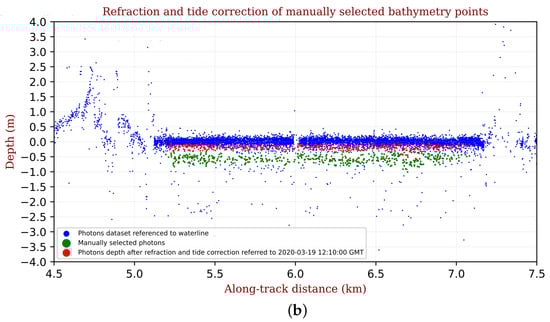 Both the semi-automatic and the manual cleaning processes allowed us to define a satisfactory dataset of “raw” bathymetric data (Figure 8: purple dots). Overall, the manual procedure identified more photons that bounced off the seabed; however, the semi-automatic procedure was less time-consuming.