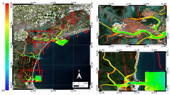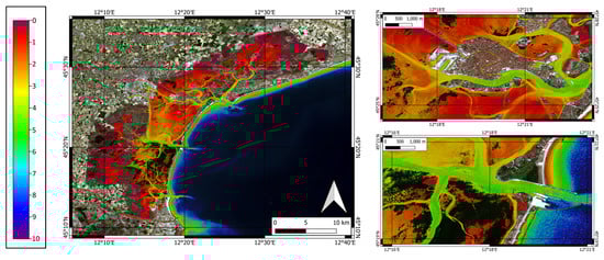 For Venice, the plot of the average errors in the lagoon area Figure 28c shows an acceptable error in the 0–3.5 m range and, for deeper bathymetry, there is a linear increase in the error with the depth, clearly showing that 3.5 m is the optical limit for the selected S-2 image in this area and period. This behavior is confirmed also by the comparison of the SDB in Figure 23 and the soundings in Figure 27: in the first one, the bathymetry computed for the channels never reaches below 5 m, while we know from the second one that there are channels that are 15 m deep and above. For the open sea area, Figure 28d shows a predominantly negative average error that reaches its maximum value of about 1.5 m around the depth of 6 m. This could be related to the high variability over time in the bathymetry of this area, taking into account that the soundings used for the accuracy check are located in the three inlets of the lagoon, characterized by strong tidal currents and frequent dredging activities that modify the bathymetry. A future study using S-2 and ICESat-2 satellite data closer in time to an investigation with acoustic techniques could provide further information on the effective capabilities of the system in areas with these characteristics. For these reasons, the datasets from the lagoon and the open sea have been separated. Since data from the open sea do not match well with the acoustic ground truth and need more studies, only the lagoon area has been considered for the resulting raster surface. Figure 30 shows the resulting surface using only depths in the range of acceptable vertical accuracy. Figure 31 highlights the four main areas of the Venice Lagoon with more detail.