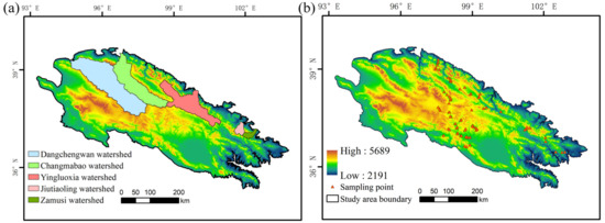 The Qilian Mountain range is located in the arid and semi-arid inland region of northwest China at the intersection of the Qinghai–Tibet Plateau, Inner Mongolia Plateau, and Loess Plateau. It spans the Gansu and Qinghai provinces and is the largest marginal mountain system in the northeastern Qinghai–Tibet Plateau. Tuanjie Peak, the highest peak of Mountain Shulenan, is 5808 m above sea level [35,36]. Starting from Wushaoling in the east and ending at the Dangjinshan Estuary in the west, the Qilian Mountains are an important water source conservation area for three inland rivers, namely the Shiyang River, Heihe River, and Shule River. This mountain range has a variety of land use and vegetation cover types, including forests, shrubs, grasslands, wetlands, deserts, and glaciers. It is a priority area for biodiversity conservation and an important eco-security barrier in northwest China. It has the important ecological function of preventing the Badain Jaran, Tengger, and Kumtag Deserts from encroaching to the south, maintaining the stability of the oasis in the Hexi Corridor, and safeguarding the supply of runoff from the Yellow River and inland rivers [37]. Figure 1 provides an overview of the study area.