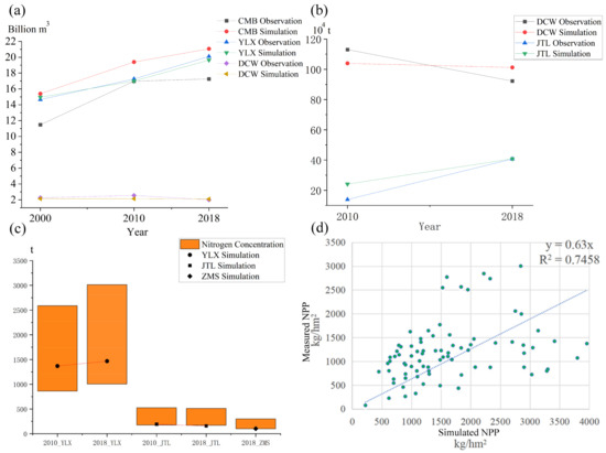 Validation of model results: (a) water resource supply validation; (b) soil conservation validation; (c) water purification validation; (d) net primary productivity (NPP) validation. CMB, YLX, DCW, JTL, and ZMS represent Changmabao, Yingluoxia, Dangchengwan, Jiutiaoling, and Zamusi hydrological stations, respectively.