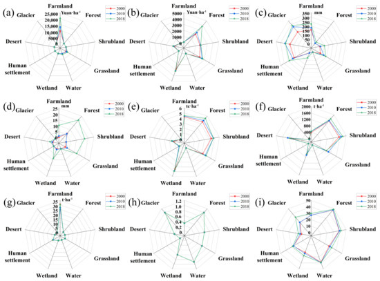 The mean soil conservation capacity in the study area was 1026.04 t·ha−1, and the three ecosystems with the largest soil conservation capacities were the shrubland, forest, and desert ecosystems. Perennial mean soil conservation was 1668.93 t·ha−1, 1570.57 t·ha−1, and 1159.30 t·ha−1 in 2000, 2010, and 2018, respectively (Figure 4f).