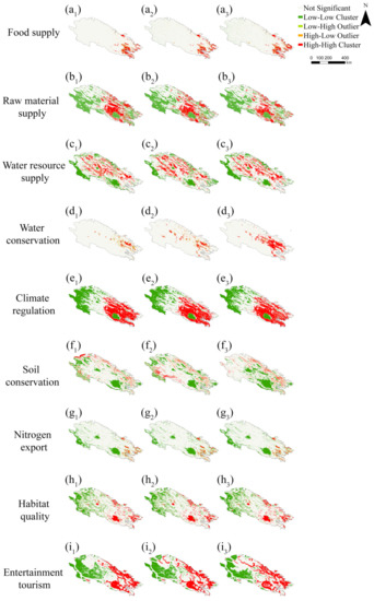 To further determine the spatial distribution of each ES aggregation area and the trade-off and synergistic relations between different ES, local Moran’s I was employed, providing insights on the spatial distribution characteristics. Local Moran’s I divided the spatial relations into high–high, high–low, low–high, and low–low aggregation.