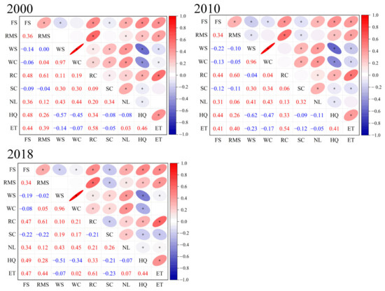 Ecosystem trade-offs and synergies in the Qilian Mountains in 2000, 2010, and 2018. * Indicates that the test for significance has been passed (p-value less than 0.05). FS, RMS, WS, WC, RC, SC, NL, HQ, and ET represent food supply, raw material supply, water resource supply, water conservation, climate regulation, soil conservation, nitrogen export, habitat quality, and entertainment tourism services, respectively. Red and blue indicate positive and negative correlations, respectively.