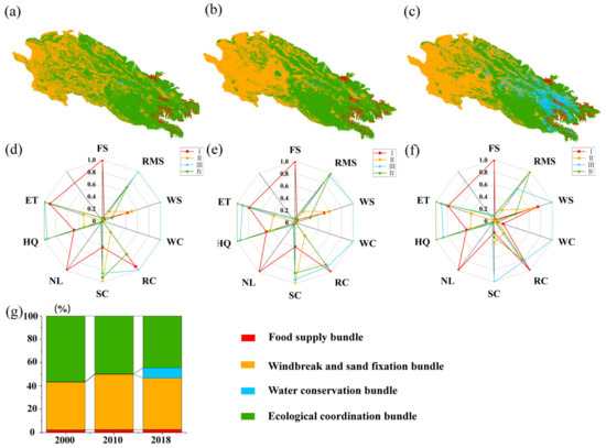 Spatial distribution and composition structure of ecosystem service bundles (ESB) in the Qilian Mountains: (a–c) ESB in 2000, 2010, and 2018, respectively; (d–f) service composition structure of different ESB in 2000, 2010, and 2018, respectively; (g) area of each service bundle in different years.