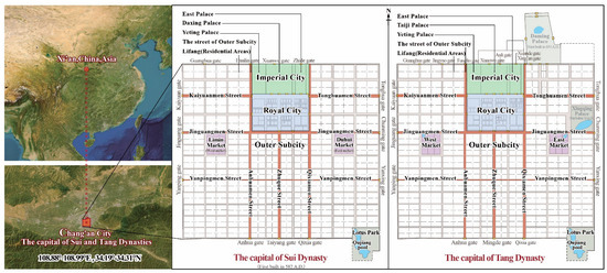 Chang’an City of the Sui and Tang Dynasties (hereinafter referred to as “Chang’an City”) was located near Xi’an, Shaanxi Province, China, with geographic coordinates of 108.88°–108.99°E, 34.19°–34.31°N. The city (Figure 1 and Figure 2) was founded in 582 AD by Yang Jian (杨坚), Emperor Wen of the Sui Dynasty; Gao Jiong (高颎), Yu Wenkai (宇文恺), Liu Long (刘龙), and others were responsible for its planning and construction. After its founding, the city was the national capital of the Sui Dynasty. After the collapse of the Sui Dynasty, the Tang Dynasty continued to use it as the national capital. Chang’an City was one of the largest (over 80 square km) capitals in the world from the 6th to the 10th centuries, accommodating up to one million people. It is currently an important heritage site under state protection in China, and the Daming Palace site in the northeast of the city is a world cultural heritage site; therefore, the city has prominent historical and cultural value and research significance [33].