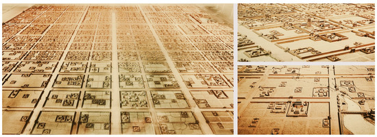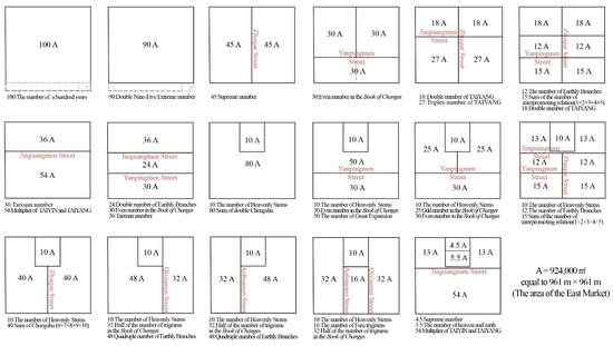 - Previous scholars found that Chang’an City of the Sui and Tang Dynasties was formed using the lengths of the Imperial City and the Royal City as the module [29] or the shape of Daxing Palace as the expanded module [30], which proves the dominance and importance of the Imperial City to the whole capital city. The research results show that there may also be a design technique for Chang’an City that takes the market area value as the basic modulus and the Daxing Palace area as the expanded modulus (twice the modulus). Daxing Palace is the most important element in the Imperial City; it is located in the center of the central axis of the capital and represents the royal family. The market is the most important element in the Outer Subcity; it is located on the east and west sides of the central axis of the capital and represents the general public. The study further reveals that the ancients tried to establish a close relationship and mutual transformation between the royal family and the public. Selecting the market as the module perhaps expresses a “people-oriented” concept; however, in order not to reduce the authority of the emperor, the designer consciously made the area of the Imperial City twice the area of the market and placed the Imperial City in the center and the market on both sides, expressing the supremacy of imperial power over civil rights.