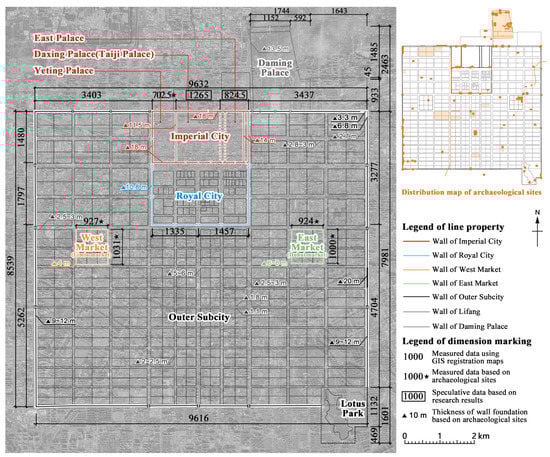 In addition, for important areas where no site remains or where the sites are insufficient to provide overall size data, we made use of previously published archaeological excavation data, such as the size of the East Market and West Market (the East Market is 924 m × 1000 m, and the West Market is 927 m × 1031 m in terms of transverse width and longitudinal length [44]) and the east–west width of Yeting Palace (the size is 702.5 m [45]). In addition, some data were inferred by scholars through study. For example, the east–west width of Daxing Palace (that is, Taiji Palace of the Tang Dynasty) was estimated to be 1285 m by scholars according to the symmetry principle and the size of Yeting Palace [45]. However, by investigating the east–west dimension of the axis from the west wall of the Imperial City to the Chengtian Gate of the Imperial City, previous scholars believed that this size was in fact 1345 m. The actual size calibrated with reference to the sites was 1335 m, so the east–west width of Daxing Palace was adjusted to 1265 m (calculation basis: 2 × (1335 m − 702.5 m) = 1265 m). The east–west width of the East Palace (previously estimated to be 832.8 m [45]) was also adjusted to 824.5 m (calculation basis: 2792 m − 702.5 m − 1265 m = 824.5 m).