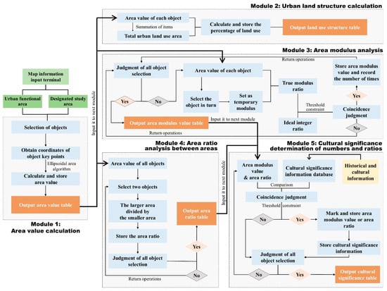 The “urban element area calculation analysis and cultural significance determination model” (Figure 5) was constructed. This model consists of the five modules of area value calculation, urban land structure calculation, area modulus analysis, area ratio analysis between areas, and cultural significance determination of numbers and ratios. Each module involves the setting of several adjustable parameters, which can be debugged and optimized through human–computer collaboration. The important parameters are the preset numbers and numerical ratios for comparative analysis, as well as the coincidence threshold.