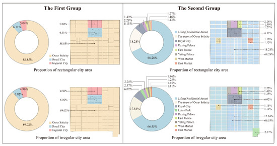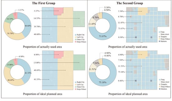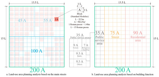 For Timgad, the residential area and street occupy a large area of the city, and the public buildings are small but diverse and concentrated in the core of the city (Figure 12). If a block in the residential is taken as a modulus (denoted by A), the whole city can be expressed as an integer value of A, the area divided by the main streets in the city can be expressed as an integer value of A (Figure 13a), and the area of different functional types in the city can also be expressed as an integer value of A (Figure 13b). For Heijo-kyo, the residential area occupies a large area of the city (Figure 14). If an ideal Fang (including its surrounding roads) is taken as a modulus (denoted by A), the area of the whole city and the main objects within the city (Heijo Palace, Left city, Right city, and Outer city) can be expressed as an integer value of A, whether for the ideally planned area or the actually used area (Figure 15) of the city.